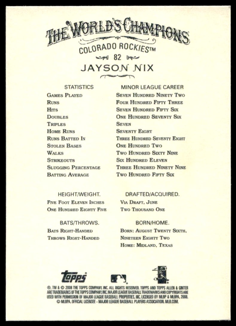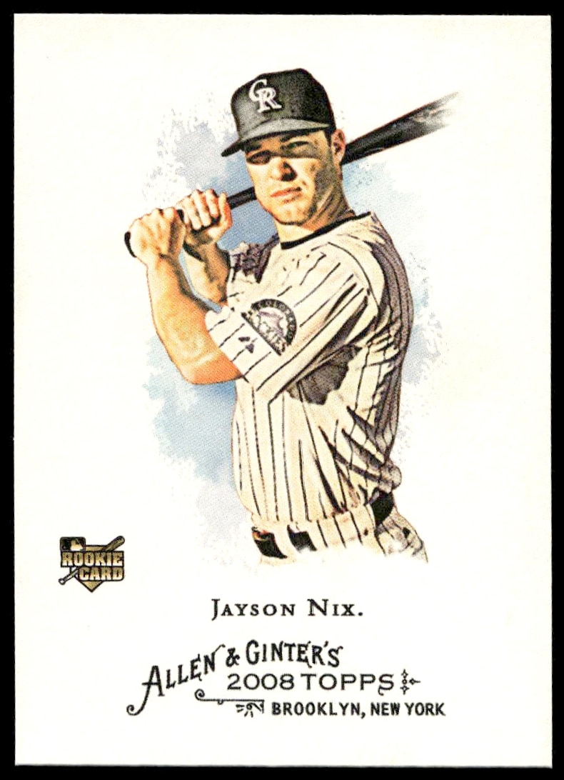 This Baseball card, from 2008 is part of the Topps Allen & Ginter card set. Jayson Nix is featured and has a card number of 82.