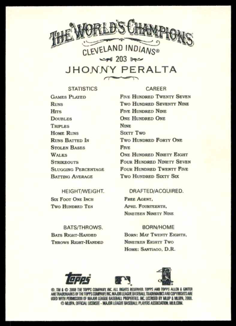 This Baseball card, from 2008 is part of the Topps Allen & Ginter card set. Jhonny Peralta is featured and has a card number of 203.