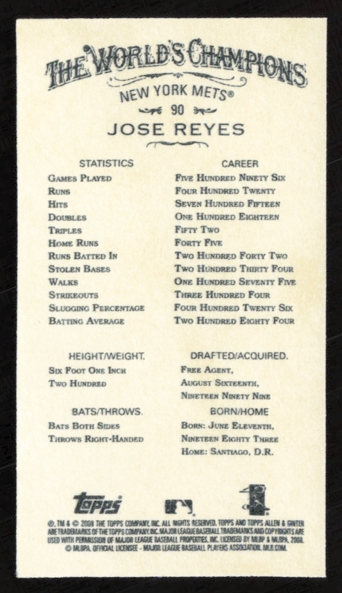 This Baseball card, from 2008 is part of the Topps Allen & Ginter card set. Jose Reyes is featured and has a card number of 90.