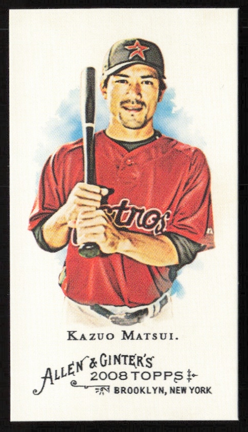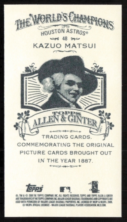 This Baseball card, from 2008 is part of the Topps Allen & Ginter card set. Kazuo Matsui is featured and has a card number of 48.