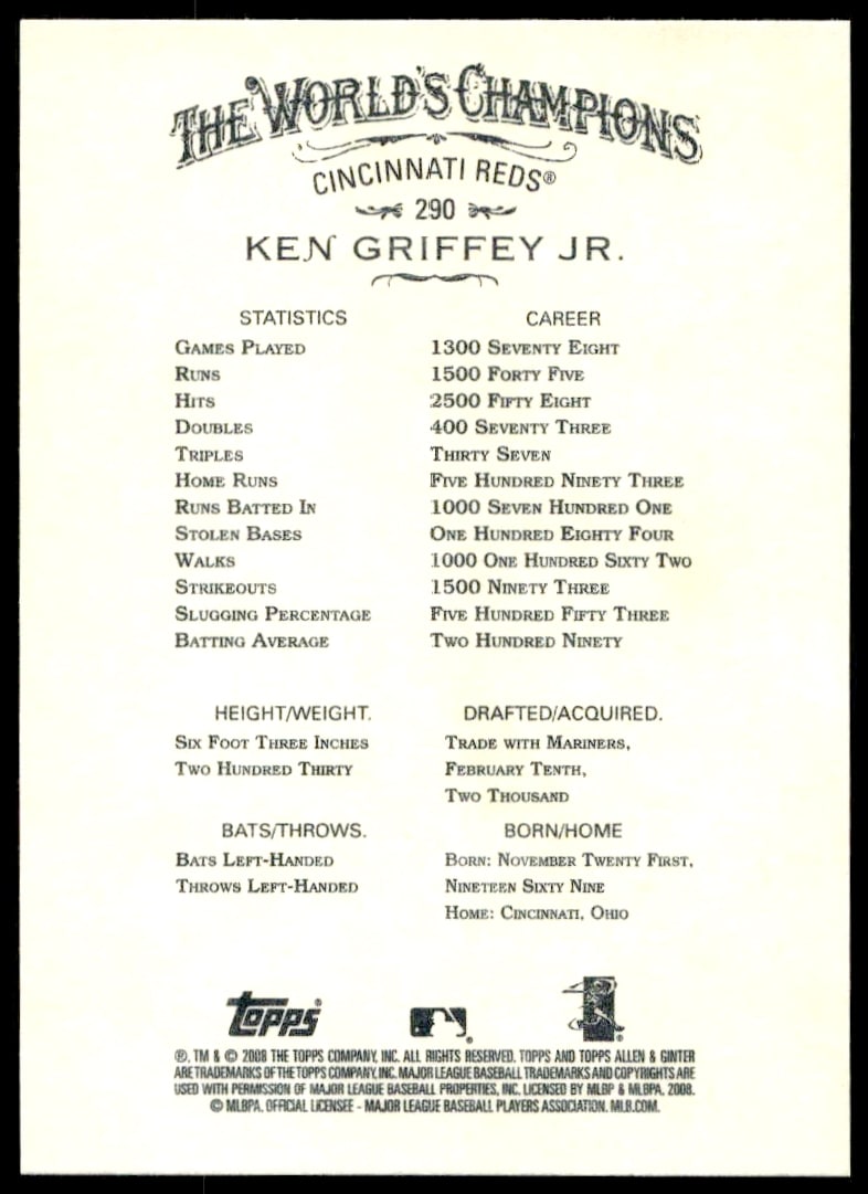 This Baseball card, from 2008 is part of the Topps Allen & Ginter card set. Ken Griffey Jr. is featured and has a card number of 290.