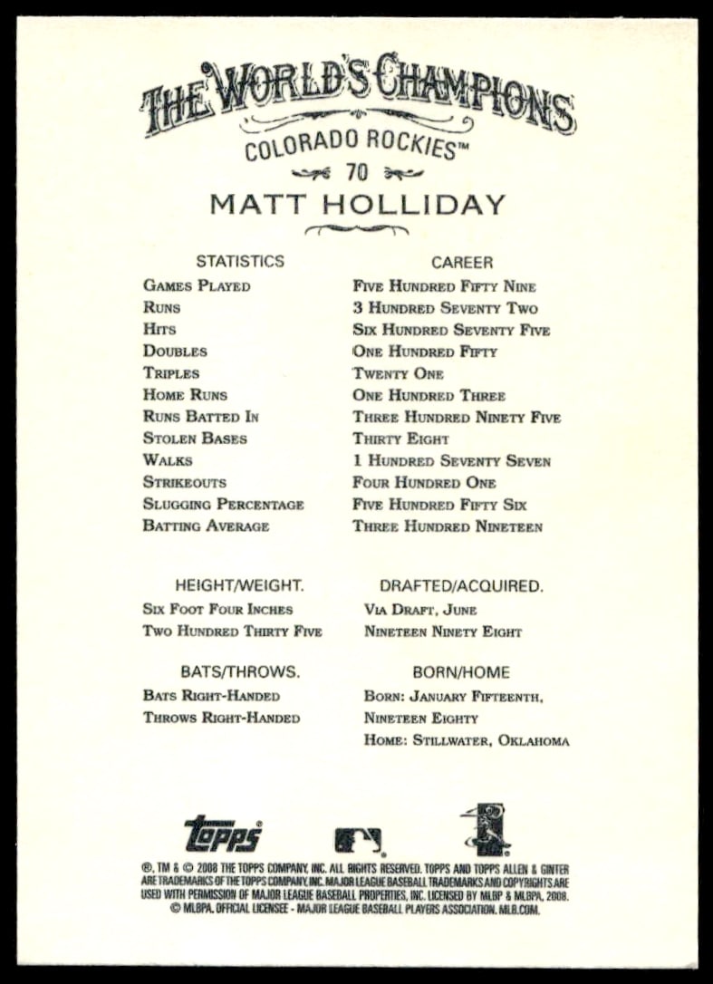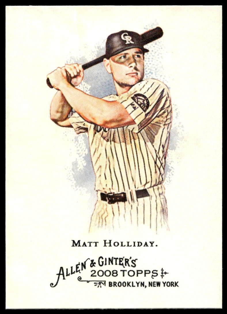 This Baseball card, from 2008 is part of the Topps Allen & Ginter card set. Matt Holliday is featured and has a card number of 70.