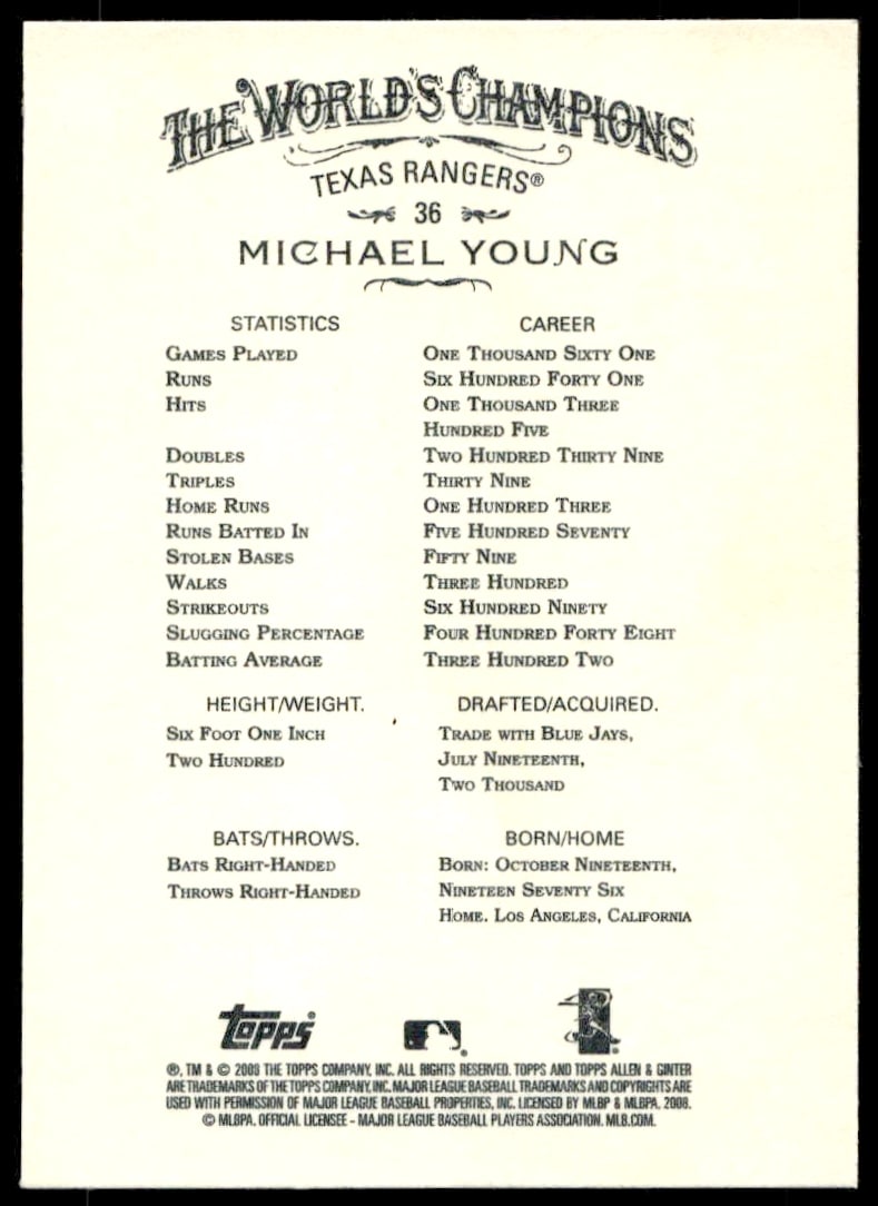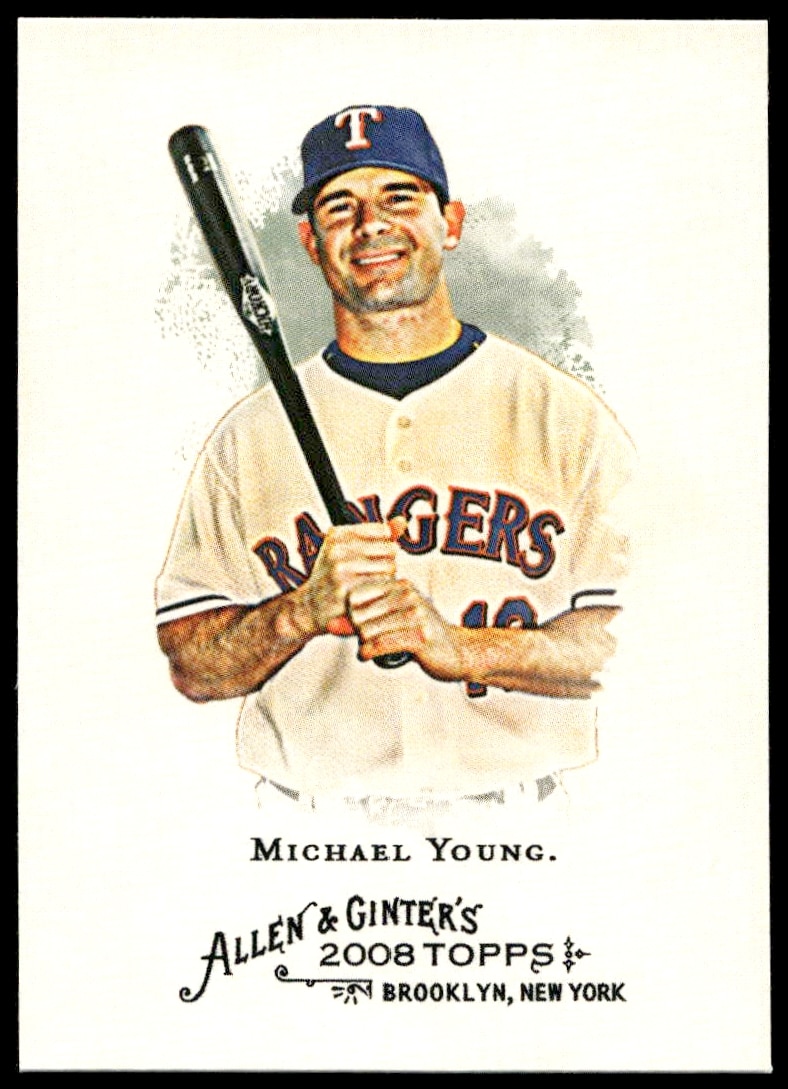 This Baseball card, from 2008 is part of the Topps Allen & Ginter card set. Michael Young is featured and has a card number of 36.