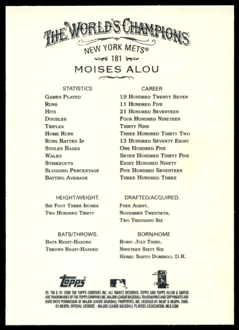 This Baseball card, from 2008 is part of the Topps Allen & Ginter card set. Moises Alou is featured and has a card number of 181.