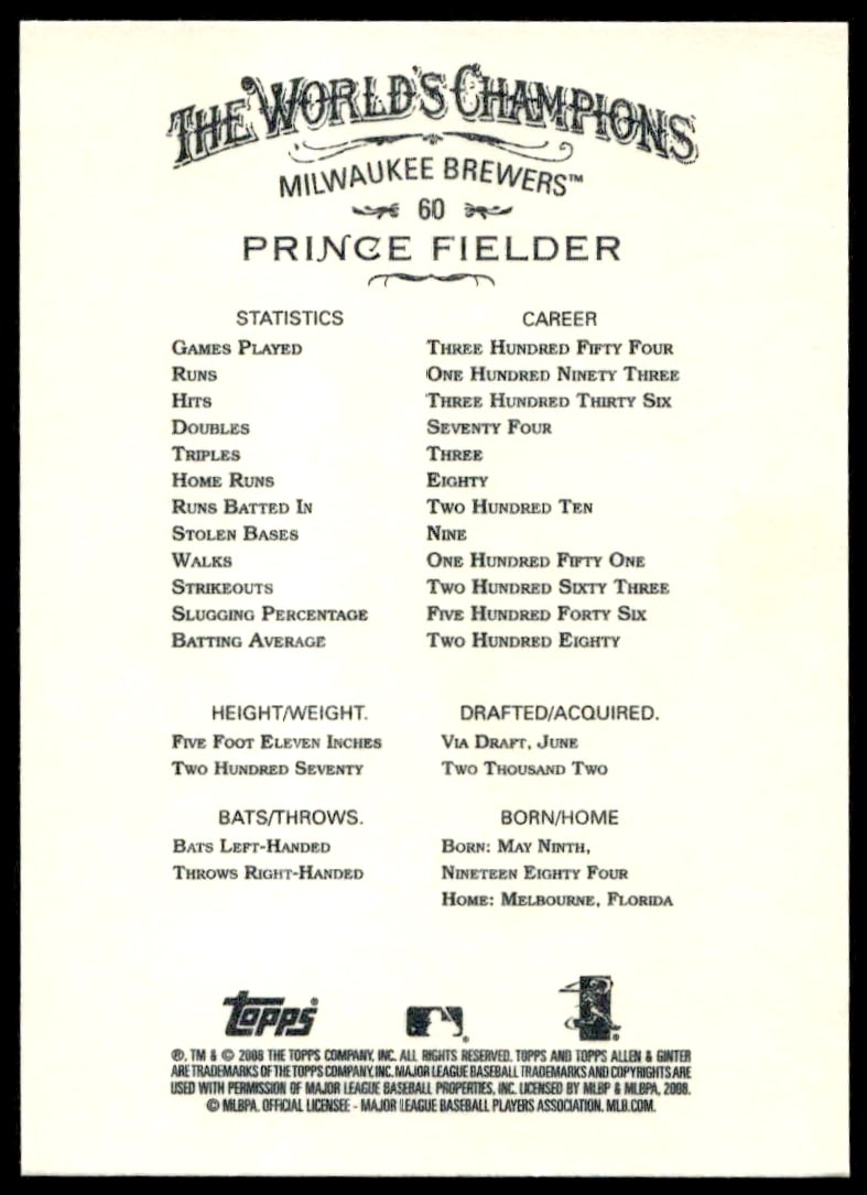 This Baseball card, from 2008 is part of the Topps Allen & Ginter card set. Prince Fielder is featured and has a card number of 60.