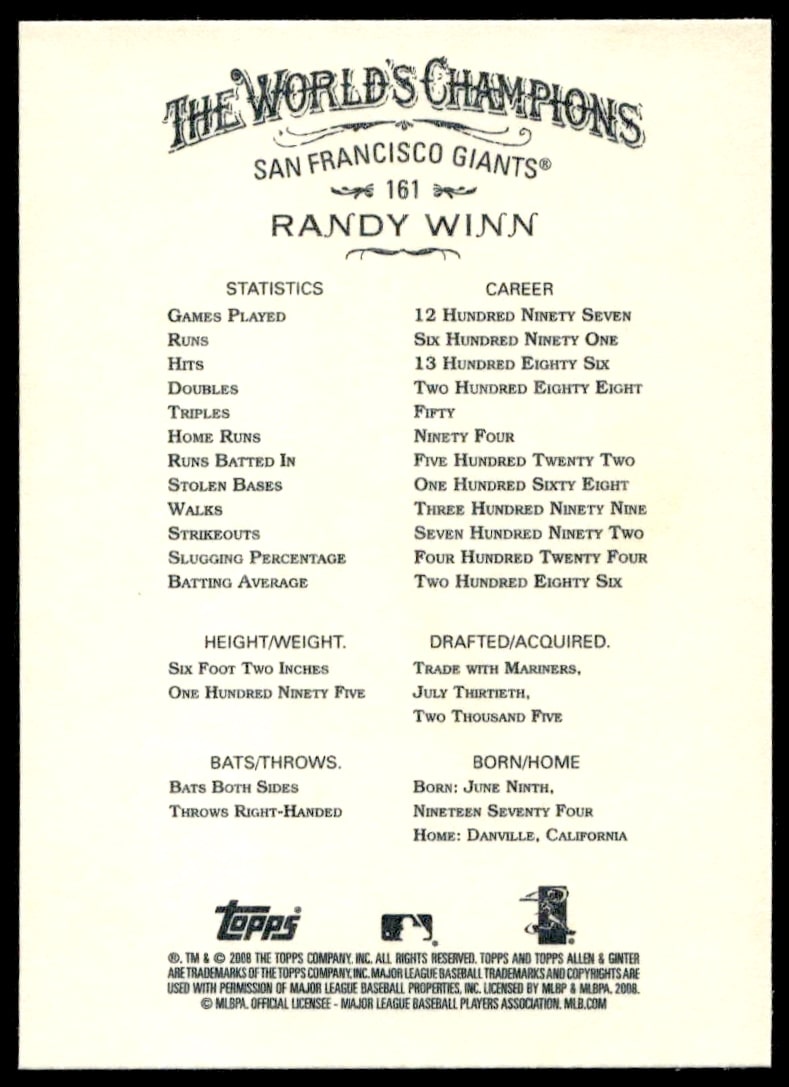 This Baseball card, from 2008 is part of the Topps Allen & Ginter card set. Randy Winn is featured and has a card number of 161.