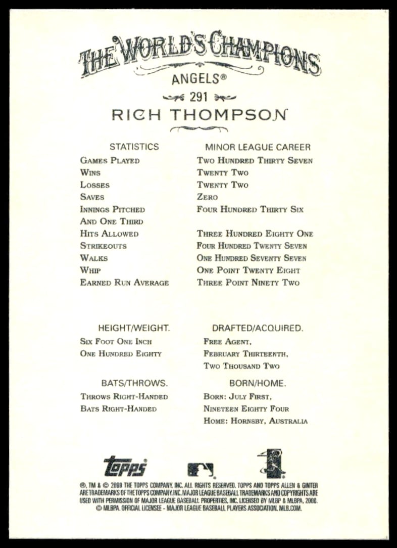 This Baseball card, from 2008 is part of the Topps Allen & Ginter card set. Rich Thompson is featured and has a card number of 291.