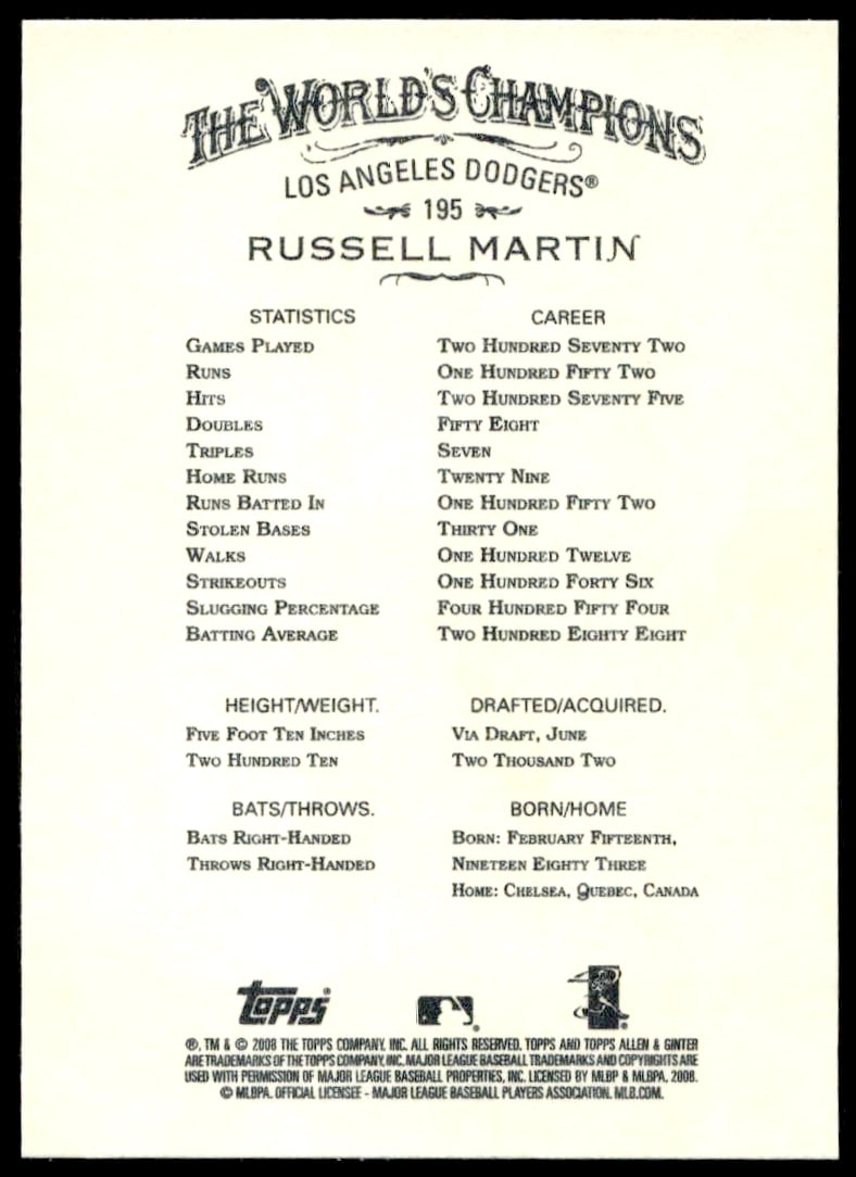 This Baseball card, from 2008 is part of the Topps Allen & Ginter card set. Russell Martin is featured and has a card number of 195.