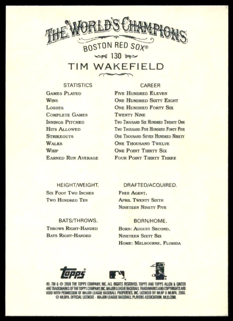 This Baseball card, from 2008 is part of the Topps Allen & Ginter card set. Tim Wakefield is featured and has a card number of 130.
