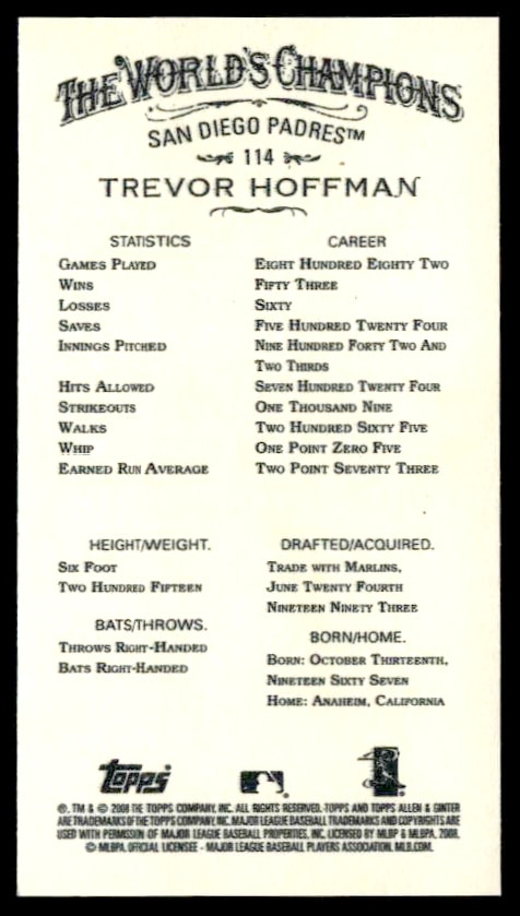 This Baseball card, from 2008 is part of the Topps Allen & Ginter card set. Trevor Hoffman is featured and has a card number of 114.