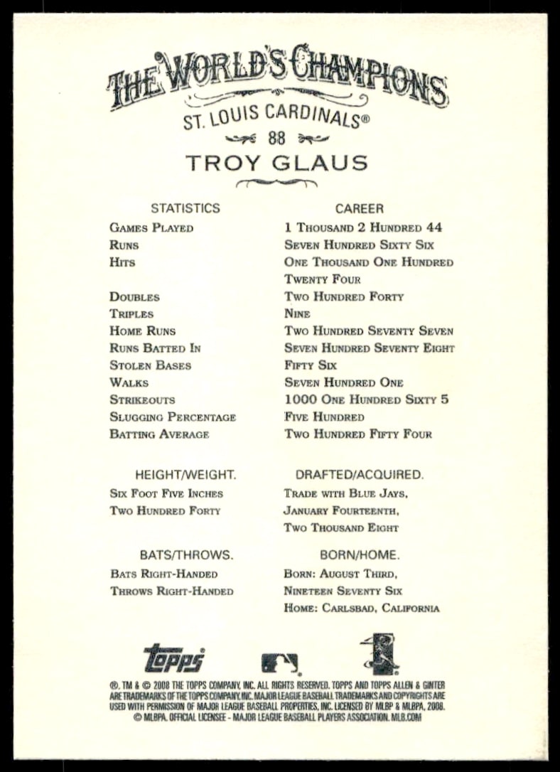 This Baseball card, from 2008 is part of the Topps Allen & Ginter card set. Troy Glaus is featured and has a card number of 88.