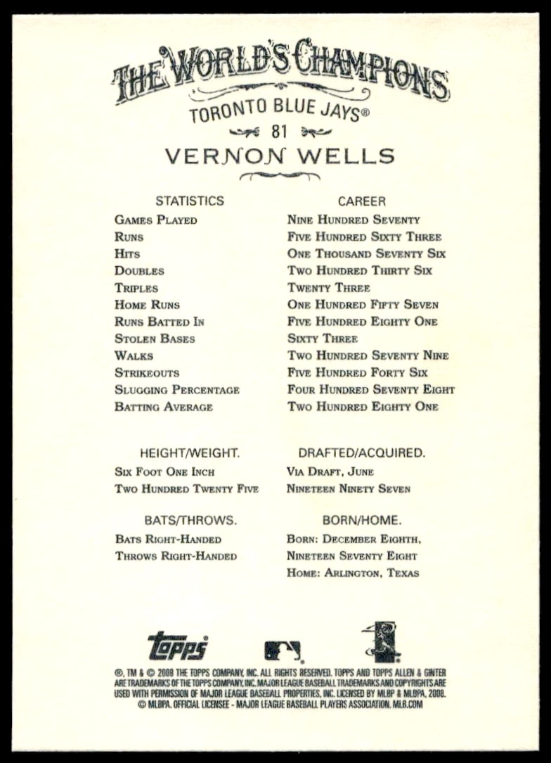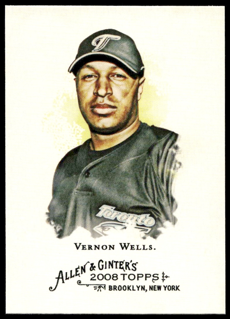 This Baseball card, from 2008 is part of the Topps Allen & Ginter card set. Vernon Wells is featured and has a card number of 81.