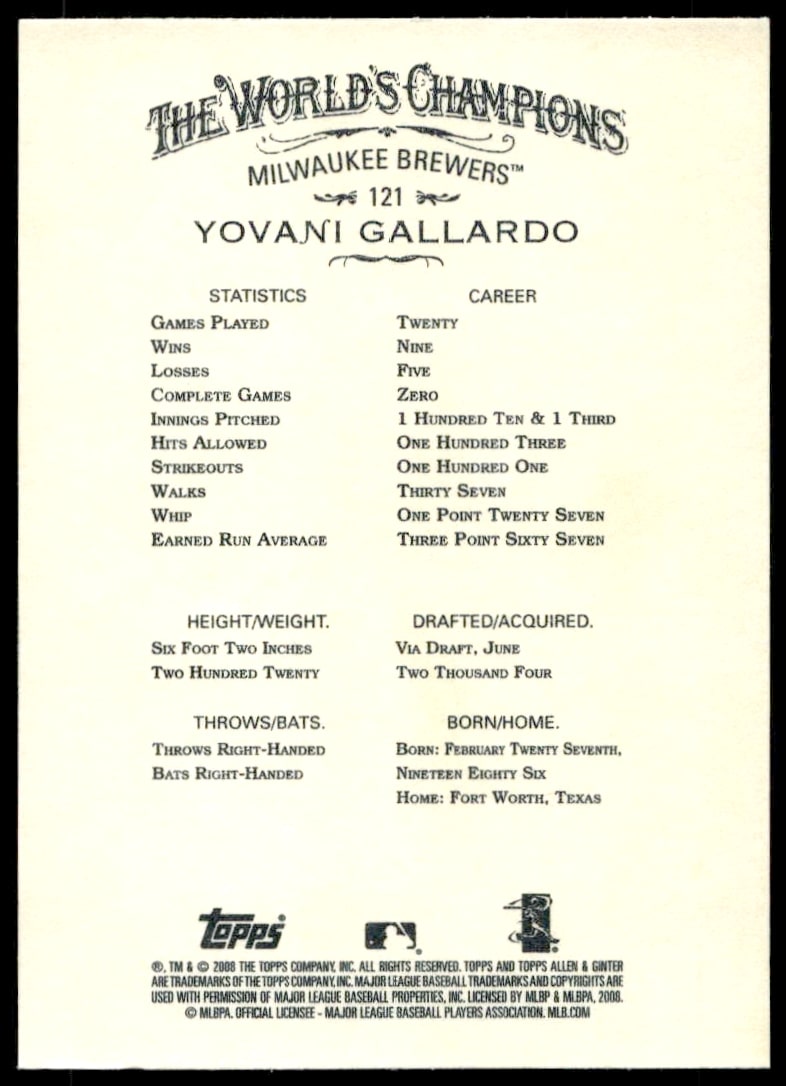 This Baseball card, from 2008 is part of the Topps Allen & Ginter card set. Yovani Gallardo is featured and has a card number of 121.