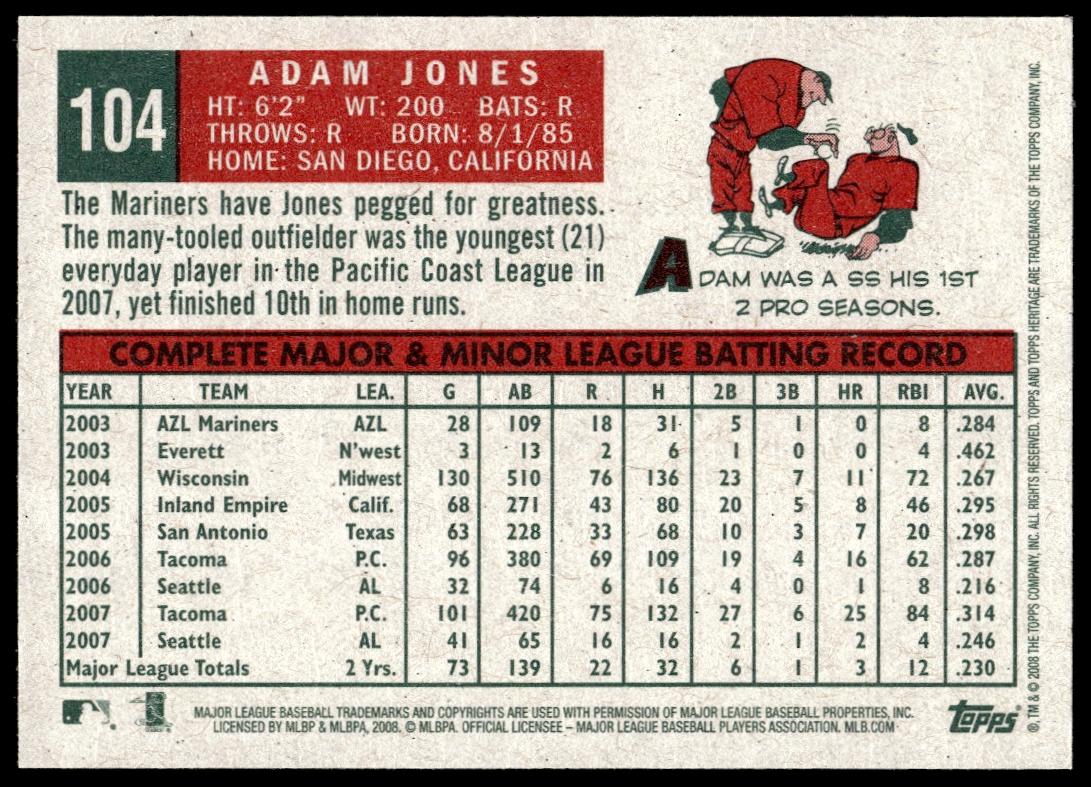 This Baseball card, from 2008 is part of the Topps Heritage card set. Adam Jones is featured and has a card number of 104.