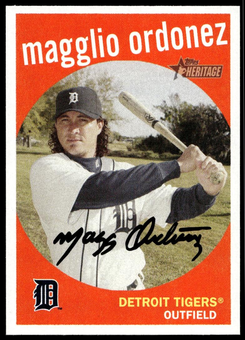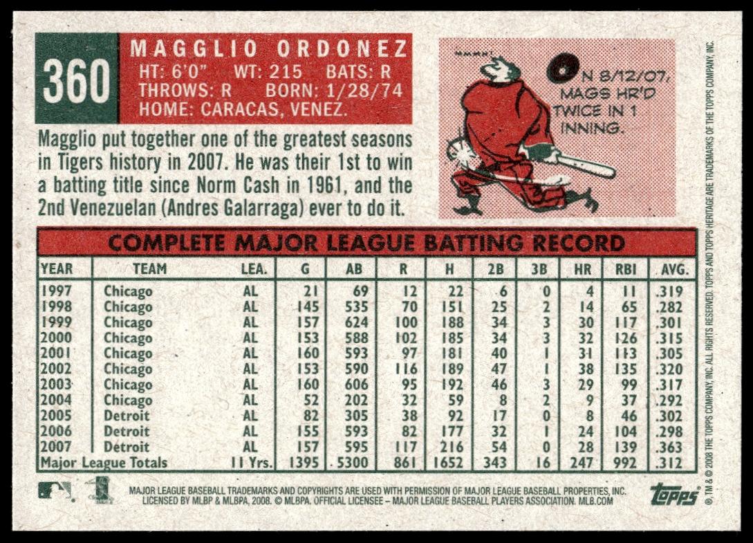 This Baseball card, from 2008 is part of the Topps Heritage card set. Magglio Ordonez is featured and has a card number of 360.
