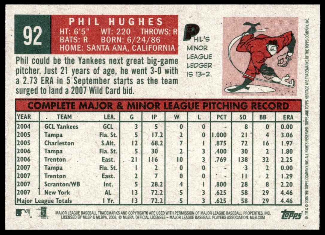 This BaseballΒ card, from 2008 is part of the Topps HeritageΒ card set. Phil Hughes is featured and has a card number of 92.