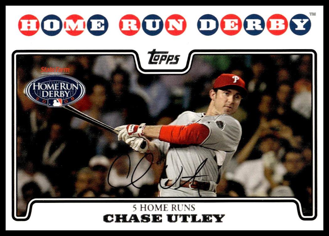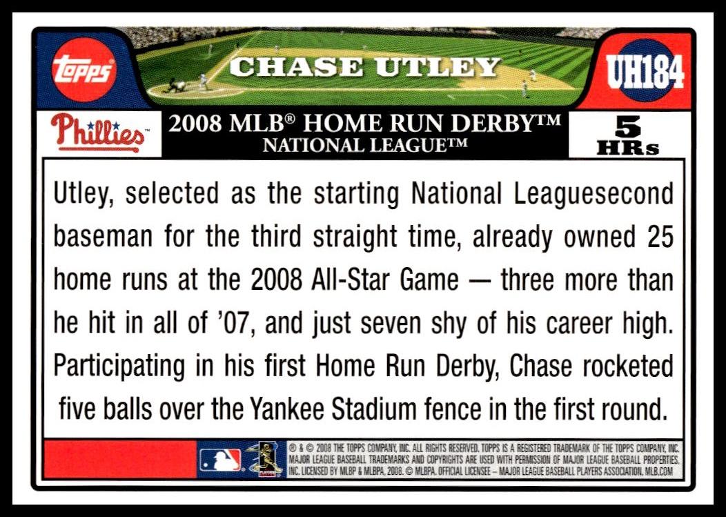 This BaseballΒ card, from 2008 is part of the Topps Updates & HighlightsΒ card set. Chase Utley is featured and has a card number of UH184.