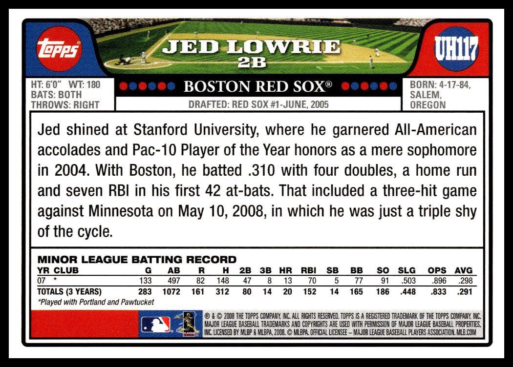 This BaseballΒ card, from 2008 is part of the Topps Updates & HighlightsΒ card set. Jed Lowrie is featured and has a card number of UH117.