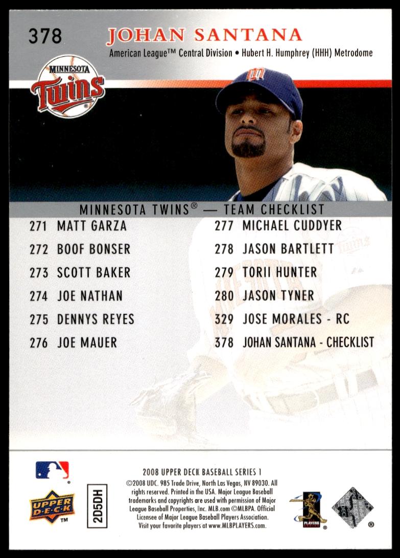This Baseball card, from 2008 is part of the Upper Deck  card set. Johan Santana is featured and has a card number of 378.