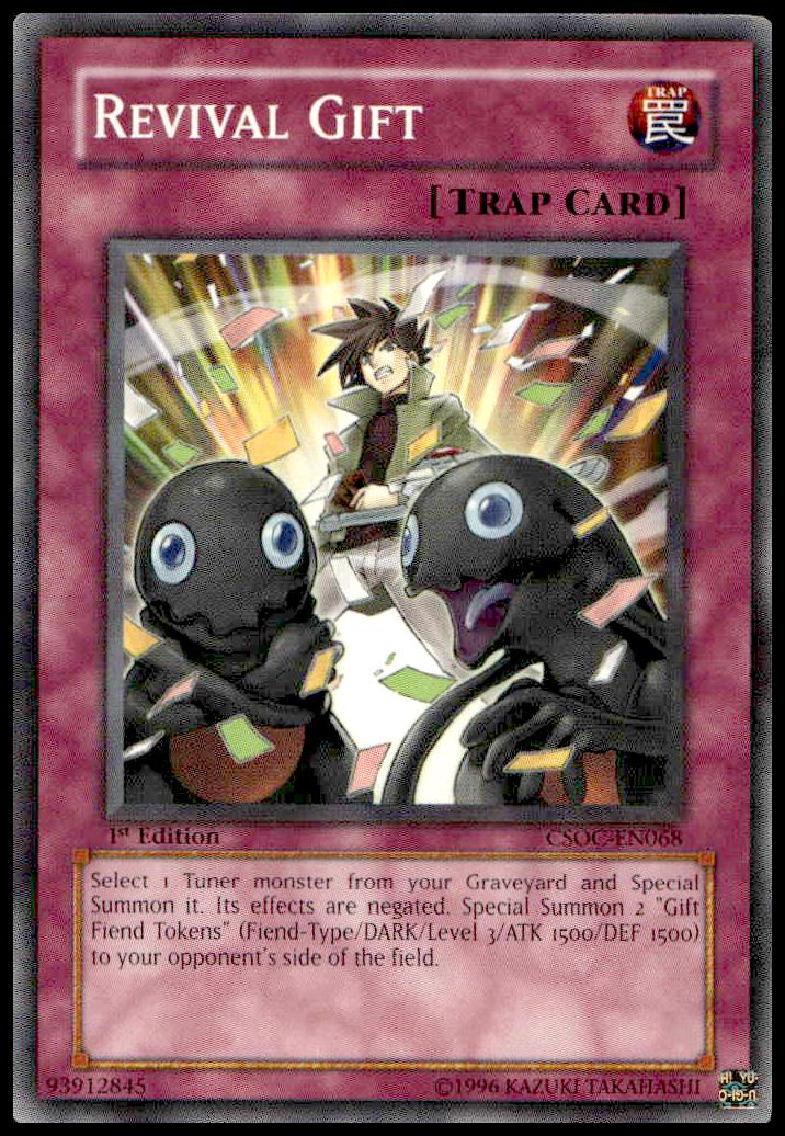 This Yu-Gi-Oh card, from 2008 is part of the Yu-Gi-Oh! Crossroads of Chaos (1st Edition) card set. Revival Gift is featured and has a card number of CSOC-EN068.