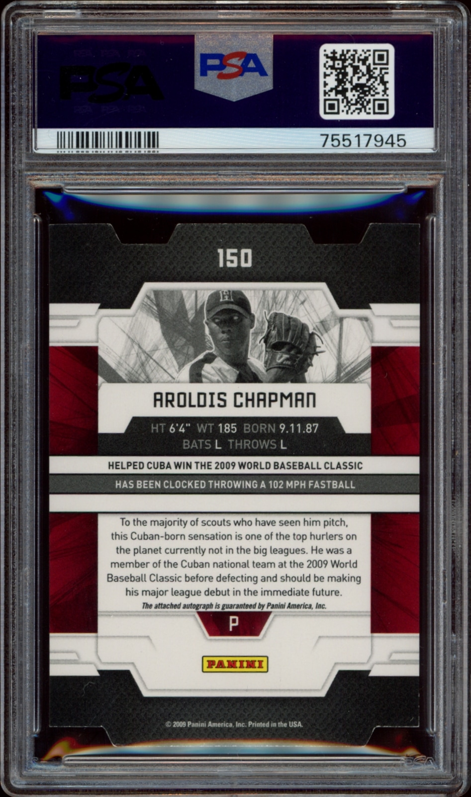 I just picked up the 2009 Donruss Elite Extra Edition Aroldis Chapman Aspirations Die Cut Auto, PSA 8. Love the die-cut design and it’s limited to just 50. A must-have for collectors, though the grade is an 8, still a prized addition to my collection!