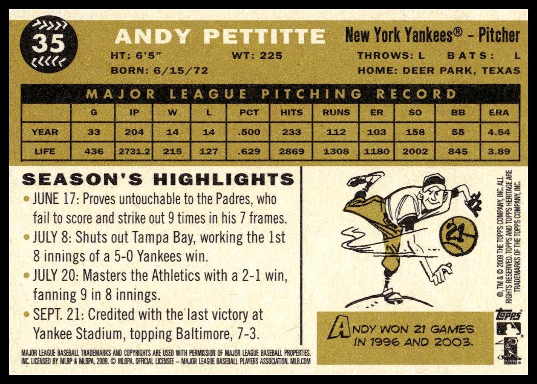 This Baseball card, from 2009 is part of the Topps Heritage card set. Andy Pettitte is featured and has a card number of 35.
