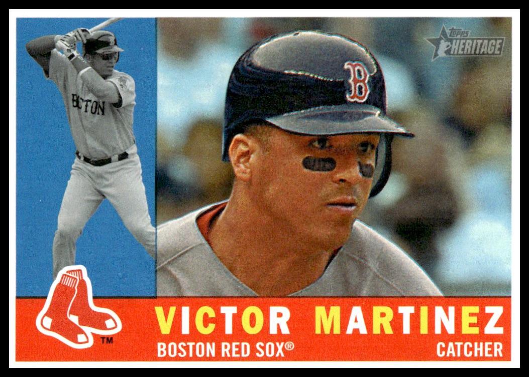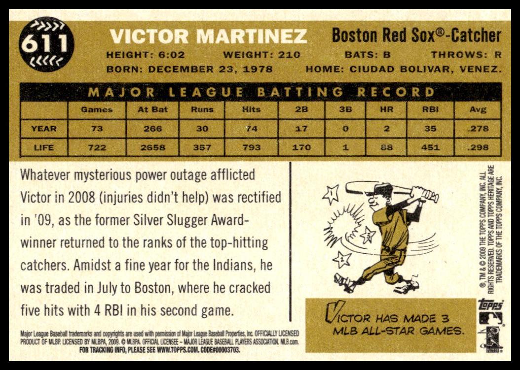 This Baseball card, from 2009 is part of the Topps Heritage card set. Victor Martinez is featured and has a card number of 611.