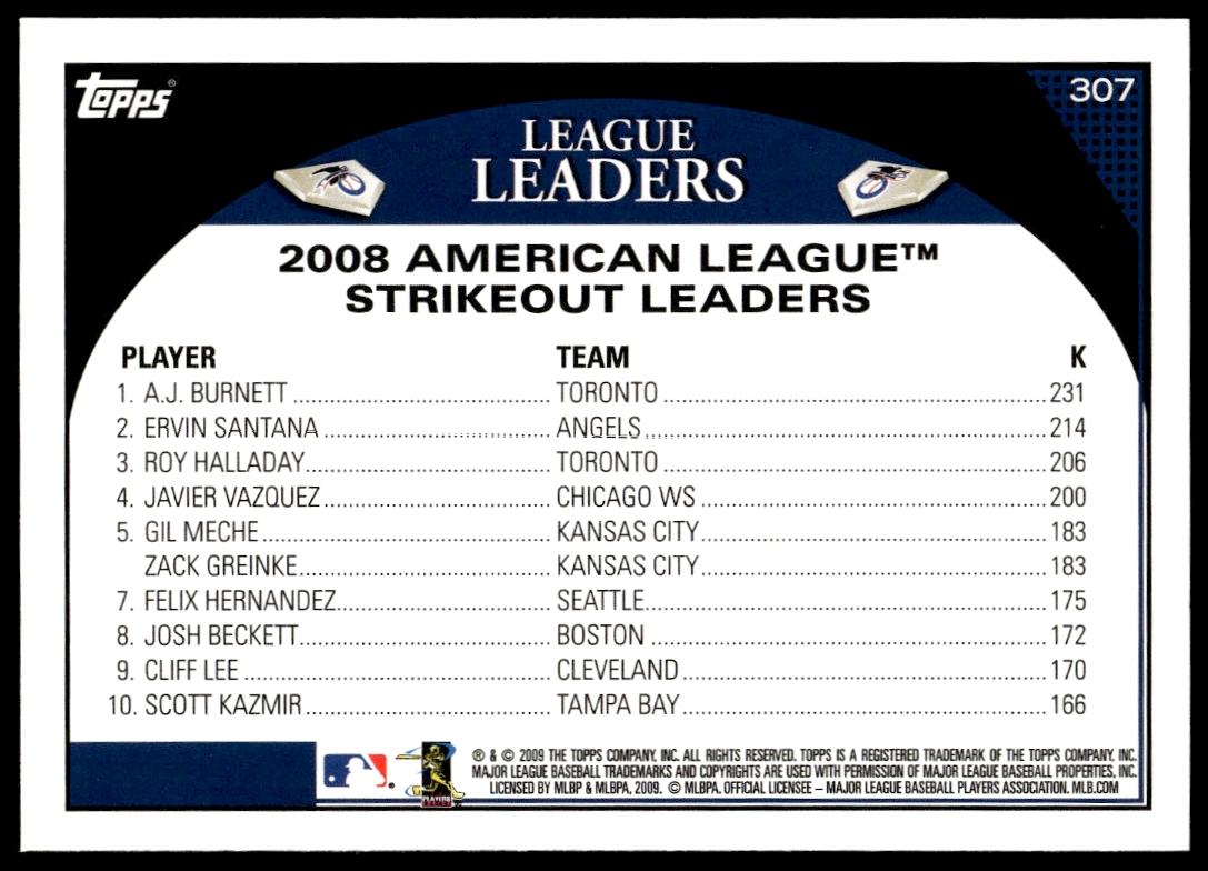 This Baseball card, from 2009 is part of the Topps Series 1 card set. A.J. Burnett / Ervin Santana / Roy Halladay is featured and has a card number of 307.