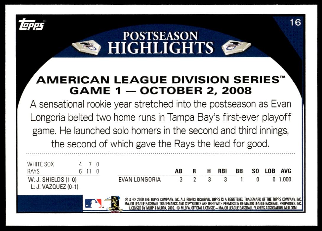 This Baseball card, from 2009 is part of the Topps Series 1 card set. Evan Longoria is featured and has a card number of 16.