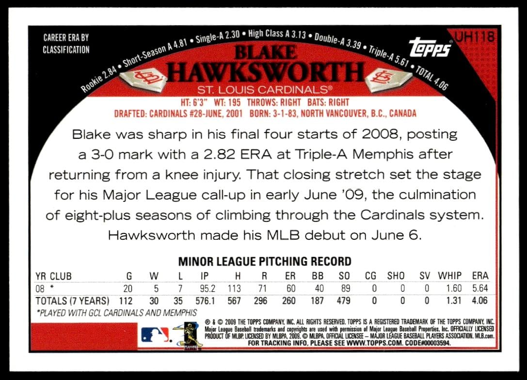 This BaseballΒ card, from 2009 is part of the Topps Updates & HighlightsΒ card set. Blake Hawksworth is featured and has a card number of UH118.