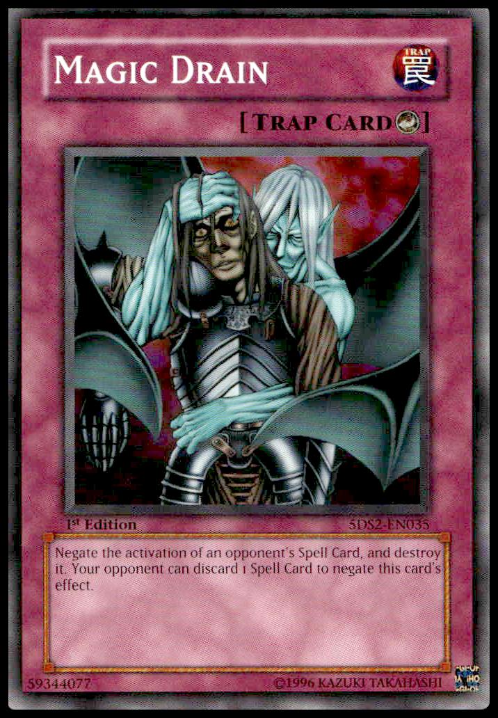 This Yu-Gi-Oh card, from 2009 is part of the Yu-Gi-Oh! 5D’s Starter Deck 2009 (1st Edition) card set. Magic Drain is featured and has a card number of 5DS2-EN035.