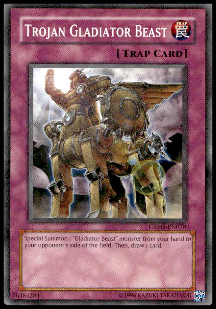 This Yu-Gi-OhΒ card, from 2009 is part of the Yu-Gi-Oh! Crimson CrisisΒ card set. Trojan Gladiator Beast is featured and has a card number of CRMS-EN078.