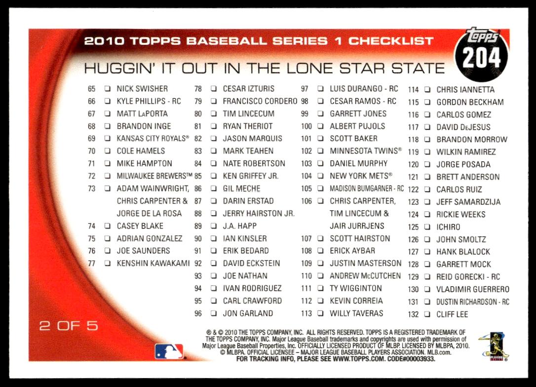 This Baseball card, from 2010 is part of the Topps Series 1 card set. Elvis Andrus / Ian Kinsler is featured and has a card number of 204.
