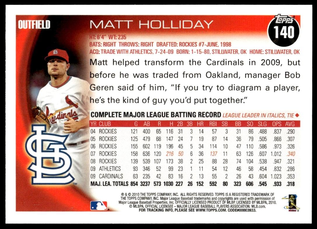 This Baseball card, from 2010 is part of the Topps Series 1 card set. Matt Holliday is featured and has a card number of 140.