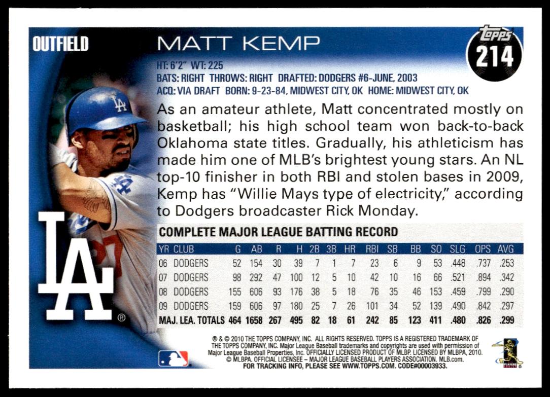 This Baseball card, from 2010 is part of the Topps Series 1 card set. Matt Kemp is featured and has a card number of 214.
