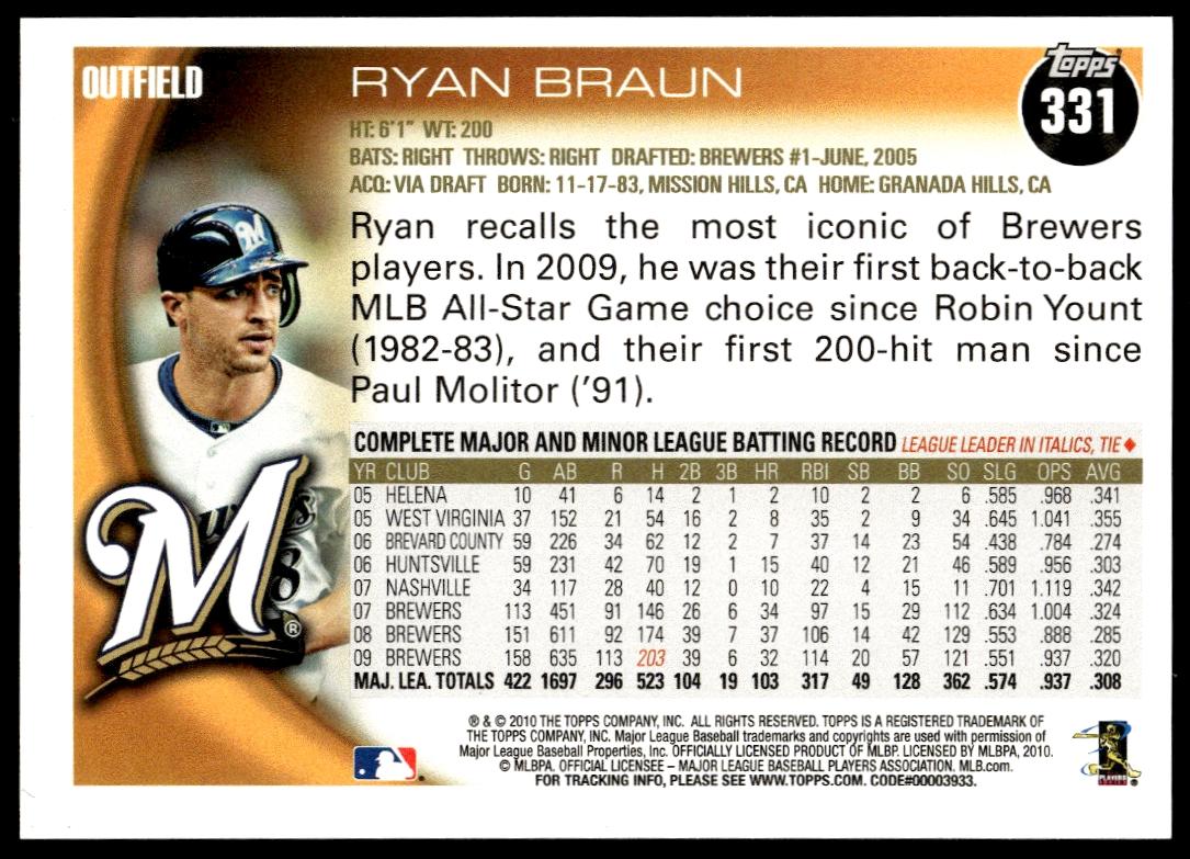 This Baseball card, from 2010 is part of the Topps Series 2 card set. Ryan Braun is featured and has a card number of 331.