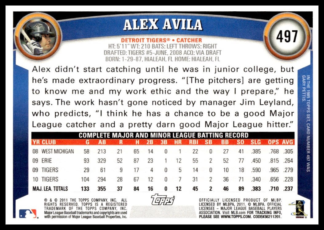 This Baseball card, from 2011 is part of the Topps  card set. Alex Avila is featured and has a card number of 497.