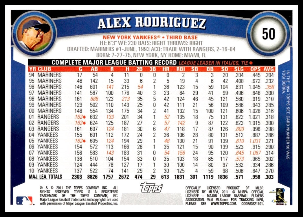 This Baseball card, from 2011 is part of the Topps  card set. Alex Rodriguez is featured and has a card number of 50.