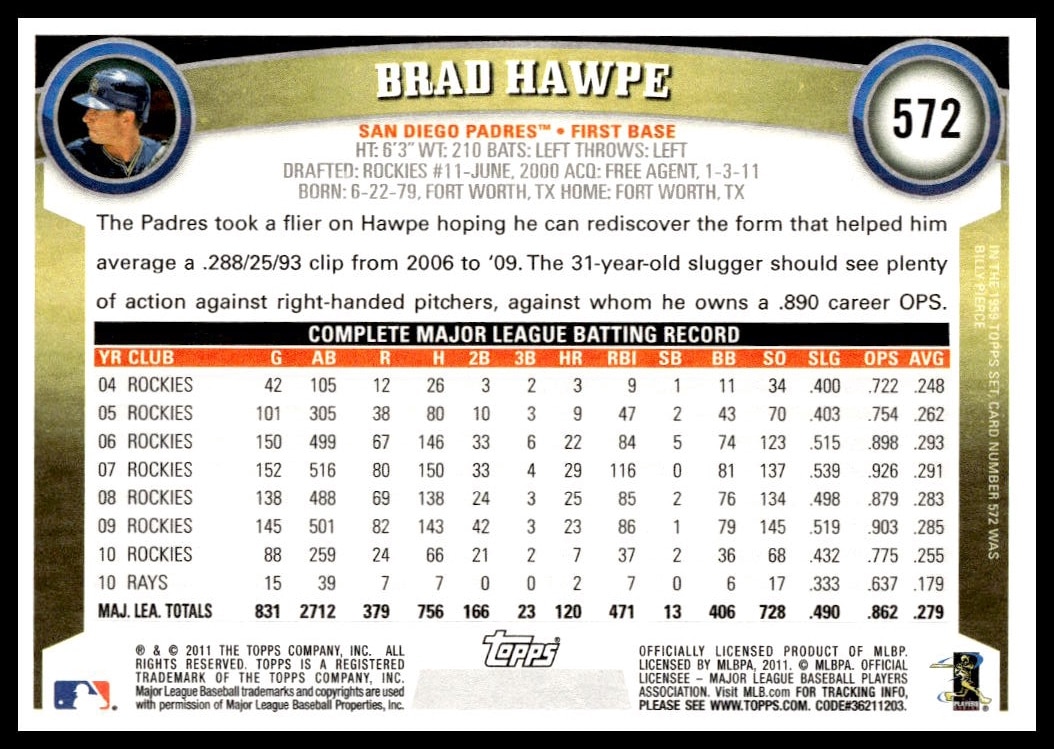 This Baseball card, from 2011 is part of the Topps  card set. Brad Hawpe is featured and has a card number of 572.