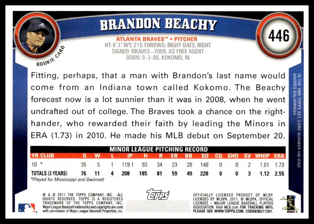 This Baseball card, from 2011 is part of the Topps  card set. Brandon Beachy is featured and has a card number of 446.