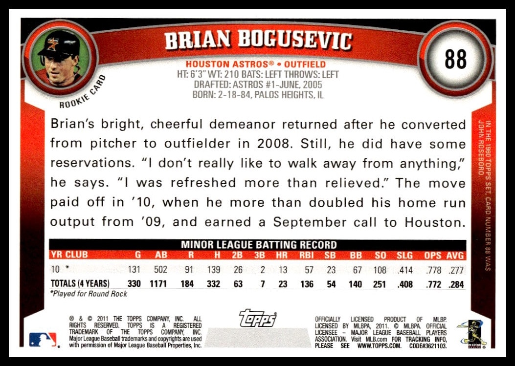 This Baseball card, from 2011 is part of the Topps  card set. Brian Bogusevic is featured and has a card number of 88.