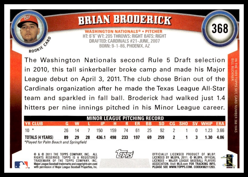 This Baseball card, from 2011 is part of the Topps  card set. Brian Broderick is featured and has a card number of 368.