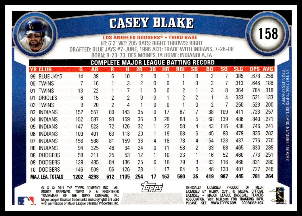 This Baseball card, from 2011 is part of the Topps  card set. Casey Blake is featured and has a card number of 158.