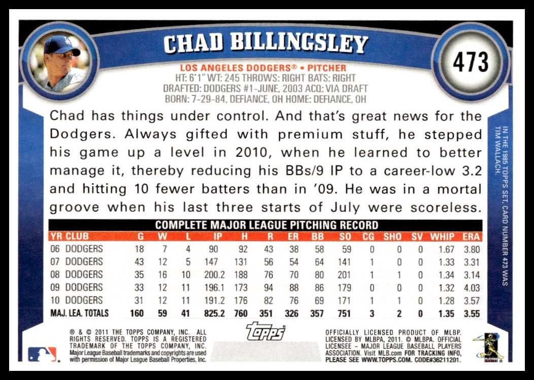 This BaseballΒ card, from 2011 is part of the Topps Β card set. Chad Billingsley is featured and has a card number of 473.