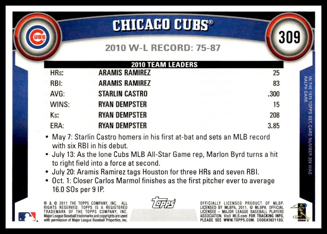 This Baseball card, from 2011 is part of the Topps  card set. Chicago Cubs is featured and has a card number of 309.