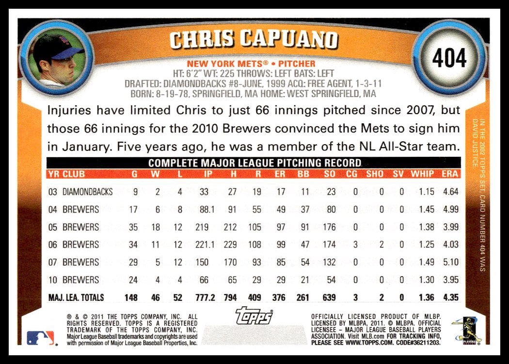 This Baseball card, from 2011 is part of the Topps  card set. Chris Capuano is featured and has a card number of 404.