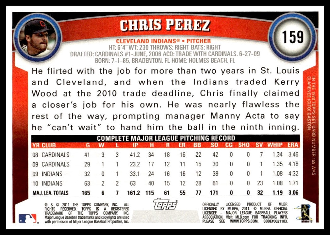 This Baseball card, from 2011 is part of the Topps  card set. Chris Perez is featured and has a card number of 159.