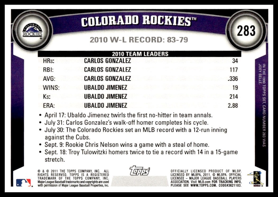 This Baseball card, from 2011 is part of the Topps  card set. Colorado Rockies is featured and has a card number of 283.
