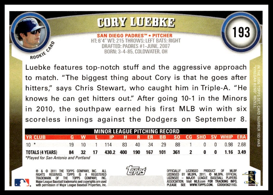 This Baseball card, from 2011 is part of the Topps  card set. Cory Luebke is featured and has a card number of 193.