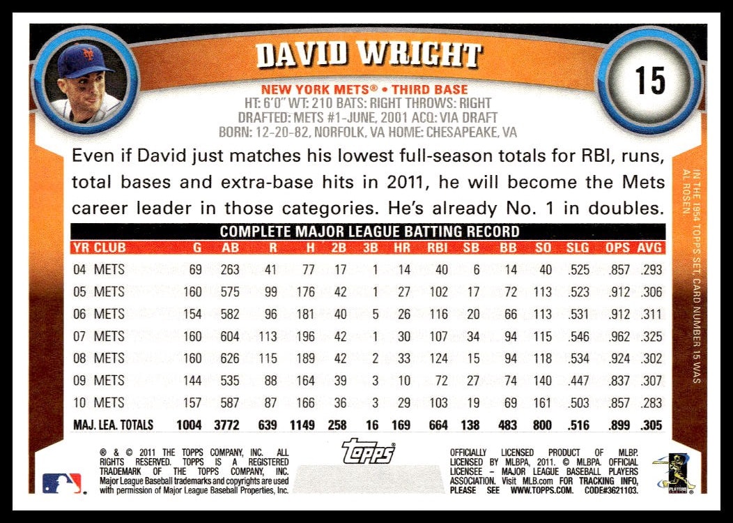 This Baseball card, from 2011 is part of the Topps  card set. David Wright is featured and has a card number of 15.